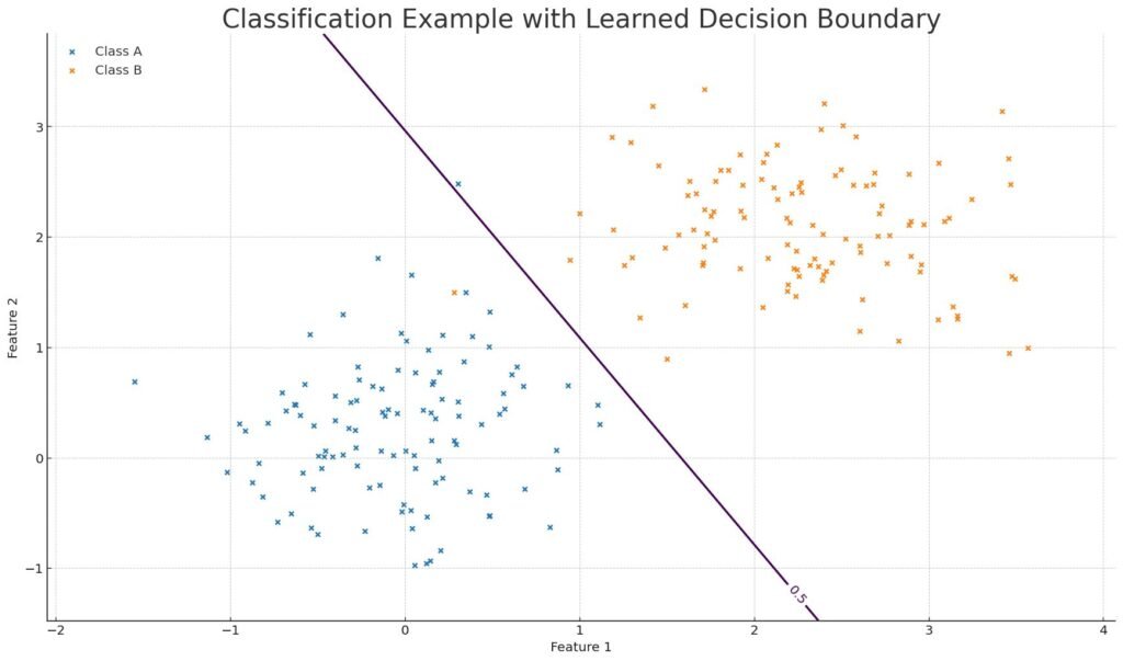 Each dot is an example. The model learns a boundary that splits classes. Training just moves this boundary to reduce future mistakes. That’s the whole game, from spam filters to face unlock at planet-scale.